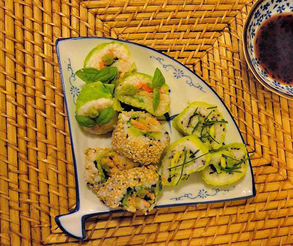La sfida è iniziata “incerottandoci” ben bene le dita… e poi tutti al banco di lavoro a coppie, per “creare” un sushi all’occidentale, sotto la guida di Marco Bianchi (la ricetta, ha assicurato Marco, piace molto ai suoi nipotini, quindi è assolutamente adatta anche ai più piccoli). Verza, carote, tonno, avocado, cetrioli, riso orientale gli ingredienti base, più una serie di spezie e intingoli per arricchire e decorare il piatto.
