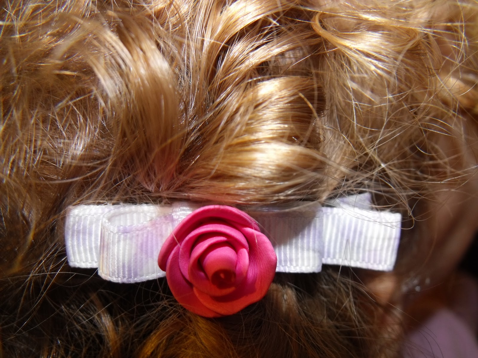 Oltre ai cerchietti, ho fatto alcune hair-clips con gli stessi nastri e tante belle roselline in pasta sintetica., che Sofia non vuole più togliersi!