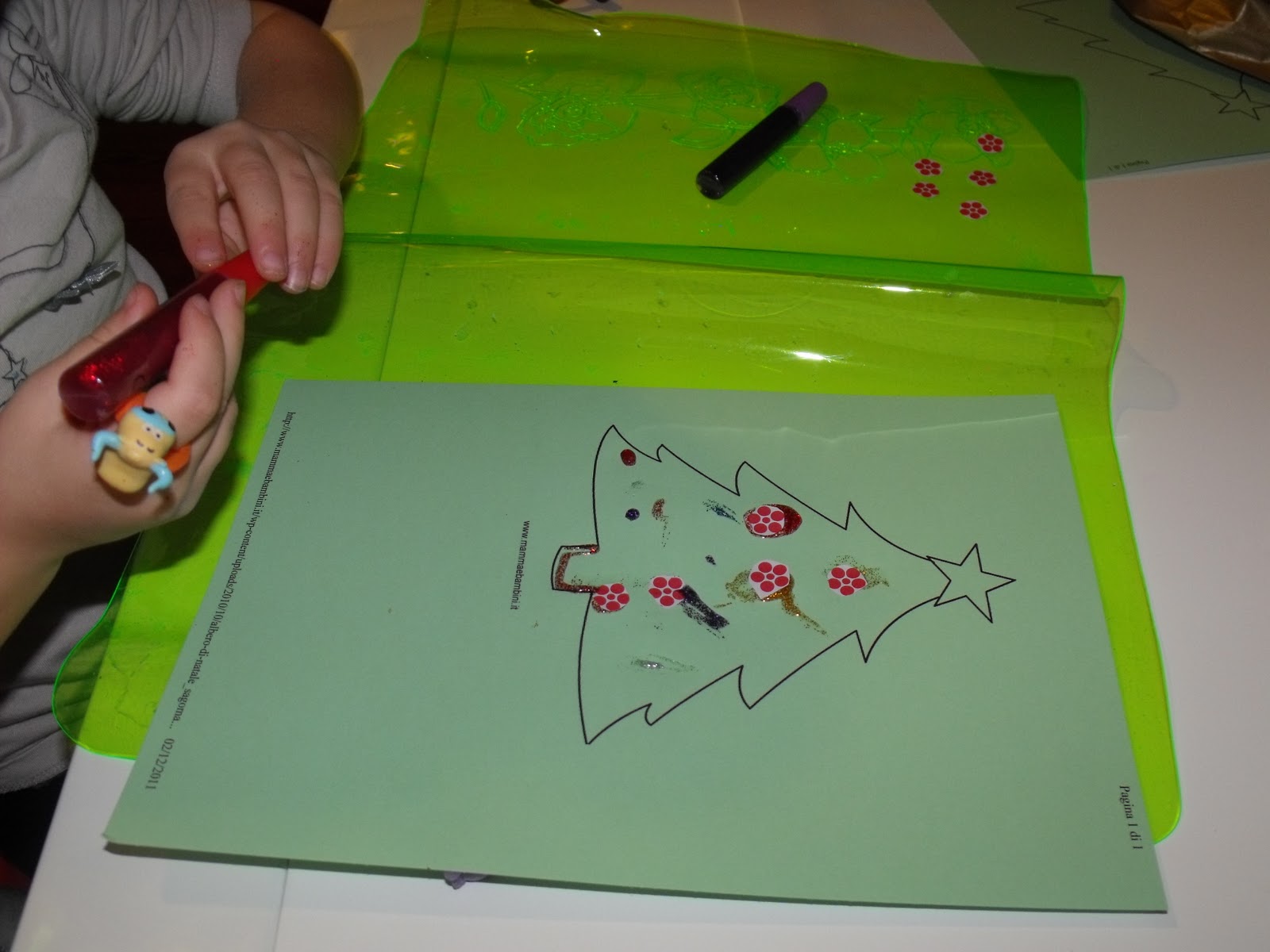 Ho preso ispirazione da Le M Cronache per far divertire le bimbe in uno di quei lunghi pomeriggi d’inverno. Ho stampato le sagome su due fogli verdi e ritagliato le “palline” da una carta da scrapbooking con texture bianca e rossa.